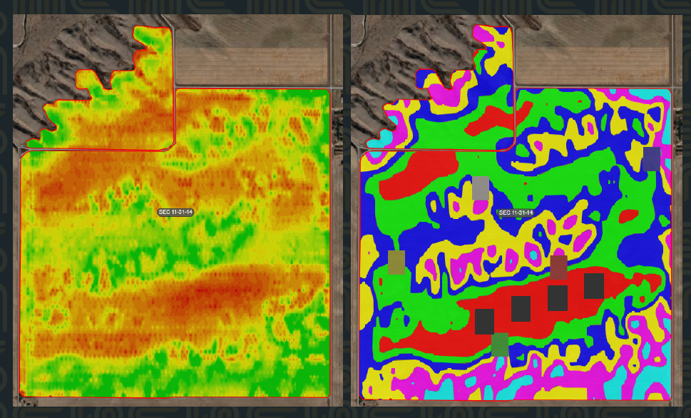 Yield Data Mapping: Most modern combines are equipped with yield monitors and GPS, allowing farmers to generate yield maps for each field at harvest. These maps show the actual crop yield (bu/acre or kg/ha) at each location, typically displayed in color gradients (e.g. green for high-yield, red for low-yield areas). Pros: Yield maps directly measure what ultimately matters – the crop output. They can integrate all factors (soil, weather, management) that affected yield. By analyzing multiple years of yield maps, growers can delineate zones based on consistent yield patterns over time: for example, areas that are always high-yield, always low-yield, or unstable. These zones are extremely valuable for VRT because they are grounded in real productivity differences. If, over 5+ years, a part of the field never breaks 30 bu/acre canola, there’s likely a fundamental limitation there (and VRT strategy might be to cut inputs to that zone or improve the soil if possible). Conversely, areas that reliably yield 50+ bu/acre canola could likely utilize a bit more seed or fertilizer to push for even higher production. Another advantage: yield data is collected as part of normal operations (during harvest), so if you have the equipment, there’s no extra field pass or imaging cost. Cons: Yield maps require proper calibration and processing – bad data from an uncalibrated monitor or combine hiccups (e.g. grain flow delays, GPS drift at field edges) can lead to misleading maps. Perhaps the biggest issue is that yield is weather-dependent. Western Canadian farmers know how dramatically a field’s performance can shift with weather – the “good” heavy clay lowland can turn into a drowned-out disaster in a wet year, while the sandy hill that always burns up could out-yield everything in a drought year. Thus, one year’s yield map might just be showing that year’s rainfall pattern. It usually takes multiple years of yield data to derive stable zones. Farmers often will overlay 3, 5, or 10 years of yield maps (sometimes weighted by a normalizing factor or by crop type) to identify the true management zones. Another challenge is when crop rotations include different crops with different yield ranges – one has to compare them carefully (e.g. 2 tons/ha canola vs 5 tons/ha wheat – which zone is higher relative performance?). Also, not all farms have yield mapping on their combines, especially smaller operators or older machines – though this is becoming standard on larger farms. In summary, yield mapping is a powerful way to delineate zones grounded in real outcomes, but it requires good data handling and enough years of information to account for climate swings. Many producers use yield maps in combination with other layers: for example, use yield maps to flag consistently low-yield spots, then use soil EC or targeted soil tests to figure out why those spots underperform (e.g. sand, salinity, etc.), leading to an informed VRT approach.